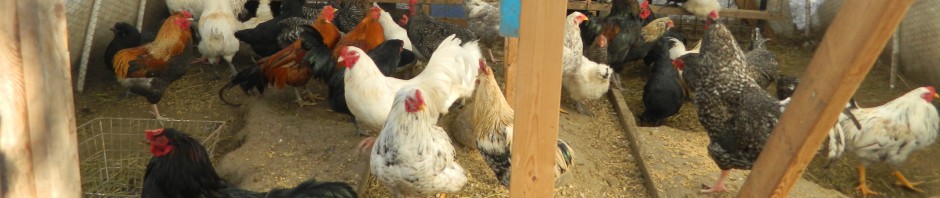 Thus the beginning of our “Vermont Farm Flock”. We have mixed Dominiques, Speckled Sussex, Astralorps, Marans, Araucanas, Chanteclers. The picture shows a Dominique hen who nested in a rabbit hutch in late fall! She raised them as we were don brooding and dealing with chicks. They ended up going to our Niece in Massachusetts.