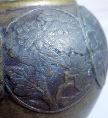 The body is circled by 9 overlapping round medallions with embossed designs of irises, peonies, lotus, etc.- including two vignettes of a bird flying through a stand of bamboo. The figural handles are shaped like winged serpents or possibly dragons.