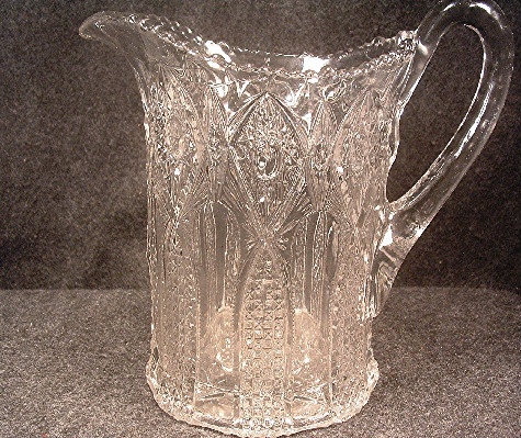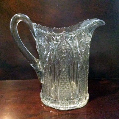 A Millersburg Glass Collector told us that the pitcher was made by Millersburg Glass Co. Imagine this Jewel Like, pattern glass pitcher sparkling in candlelight! The elegance of silver for a much smaller investment!