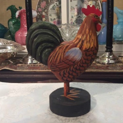 This Hand Carved, American Folk Art Rooster measures 8″ tall and 6″ long.