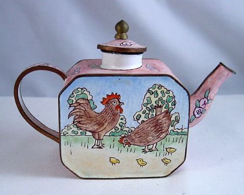 Kelvin Chen Style – Enamel Copper Cloisonne Tea Pot – Rooster / Hen & Chicks – The Whole Family!