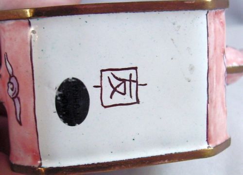 This charming vintage Chinese enameled teapot measures 4-3/4″ spout-across-handle by 3-3/4″ to the top of the finial by 1-3/4″ deep.