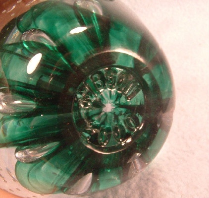 This paperweight is marked on the bottom, “Gibson 2000”. The beautiful controlled bubbles crystal & green glass apple measures 4″ tall to the top of the stem, and approximately 3″ in diameter.